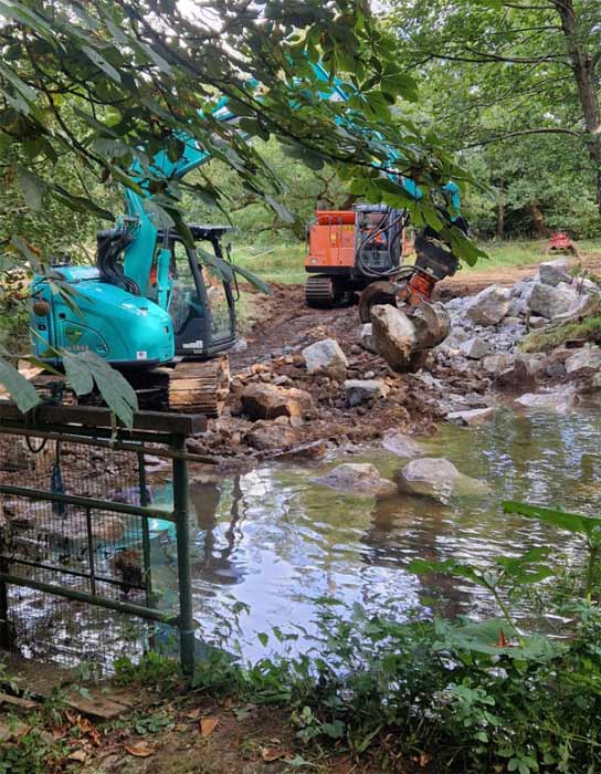 The weir, which had been in danger of being undermined and collapsing for some time, was replaced by a rock ramp. This work was planned and overseen by the National Trust's Riverlands project. more information can be found on the Mill Race and Launder page